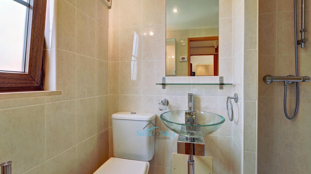 The living room boasts a wall of windows, flooding the room with lots of natural light and making the most of the views. Patio doors lead to a sun room and the pool terrace, perfect for seamless indoor - outdoor entertainment. The living room also benefits from a wood burning fireplace ideal for those cosy nights, plus air-conditioning to heat and cool. Stairs lead down to a bedroom which benefits from a soaker bath tub, an en-suite shower room with underfloor heating, built-in wardrobes and a patio door leading to the outside terrace.