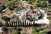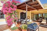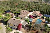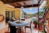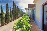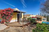 The house is surrounded by a paved terrace and has low maintenance automatically irrigated gardens with winding paths. There is also an orchard with a variety of mature fruit trees including lemon, orange, Seville orange, satsuma, lime, avocado, olive, almond, and apricot, and there are various outbuildings providing extensive storage.