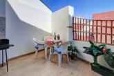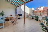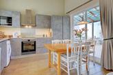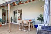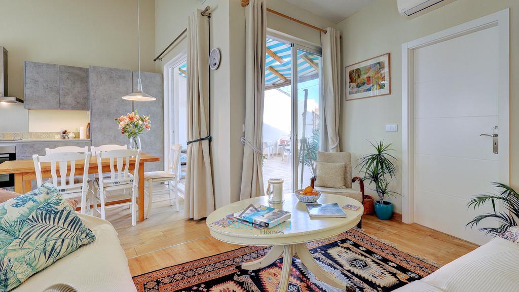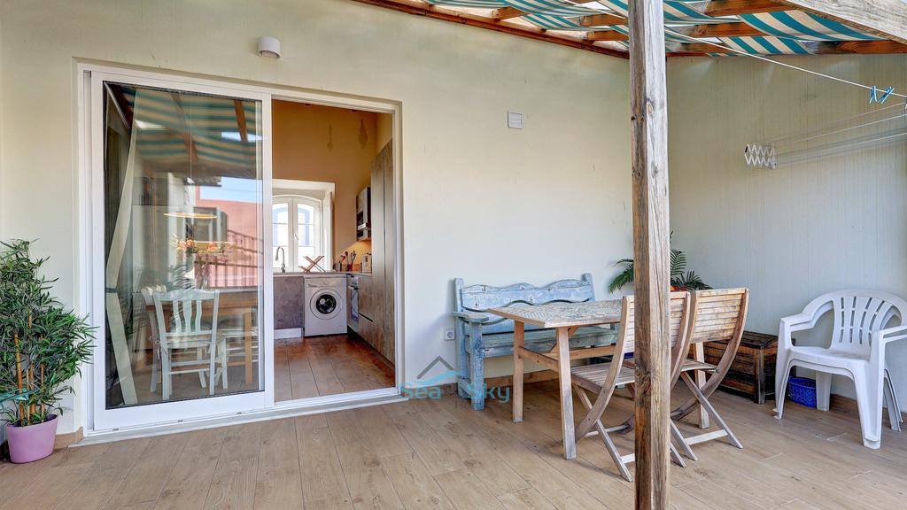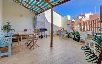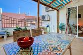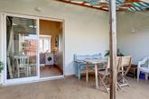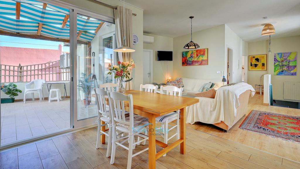 The front door opens to a small entrance hall with space to leave your shoes and coat, an interlocking door leads to the ground floor apartment which also has its own independent entrance. Stairs lead up to the bright and sunny upstairs apartment, straight into the spacious lounge area.  There is plenty of space for sofas and relaxing, with patio doors leading to the delightful sunny terrace flooding the room with abundant natural light. Next to the lounge area is a dining area that is open-plan to the kitchen. The kitchen, with a double height ceiling, is well-fitted with plenty of cupboards and a built-in microwave, oven, hob and extractor, as well as a freestanding washing machine, dishwasher and fridge/freezer. Patio doors open to the terrace, perfect for seamless entertaining, alfresco dining and BBQ's. There is plenty of space to relax, and it also benefits from electric and water access.