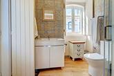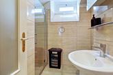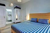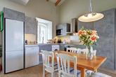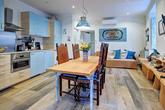 Downstairs, the front door (or the interlocking door) opens to a spacious kitchen - lounge - dining room. The well-fitted kitchenette boasts a built-in oven, electric hob and extractor as well as an undercounter fridge. This open-plan space boasts beautiful built-in hand carved wooden window seats and shelves. There is plenty of space for a sofa bed plus dining table and chairs for entertaining. The spacious bedroom has an en-suite bathroom with a walk in shower, and from this bedroom there is an access door to the garage. There is also a separate bathroom with walk-in shower, ideal for guests.
