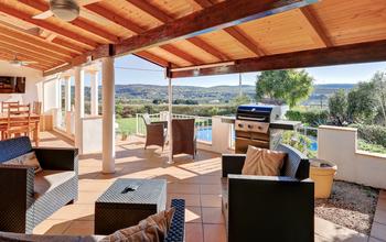 Um corredor liga a casa de banho familiar com cabina de duche fechada, lavatório e toalheiro aquecido, e 2 dos quartos (um virado a norte com vista para as colinas e outro virado a sul com vista para o jardim e o vale). Uma porta do hall abre-se para um generoso terraço de entretenimento coberto, virado a sul. Existe um amplo espaço para jantar e relaxar junto à área de churrasco, e um telhado de telha proporciona muita sombra. O terraço tem vista para a piscina cintilante e para o jardim paisagístico, com vista para os pomares e para as colinas. Os degraus conduzem ao relvado bem cuidado e um caminho leva a uma área de estar isolada com excelentes vistas para o vale.